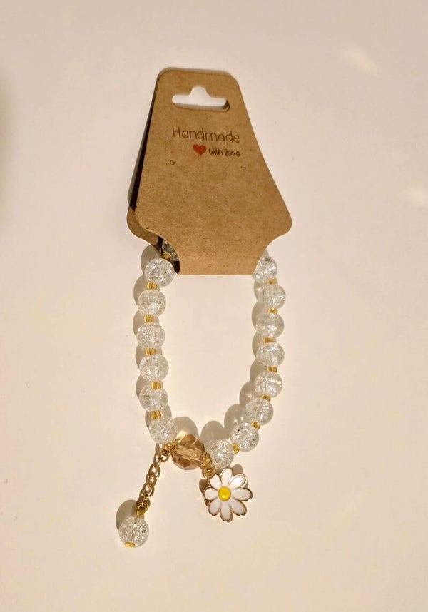 White crackle glass bead bracelet with white enamel and gold daisy detail