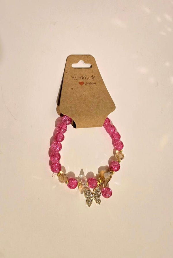 Pink crackle glass bead bracelet with a sparkly rhinestone and gold butterfly detail