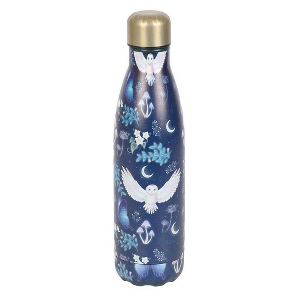 This mystical navy-blue water bottle features flying night owls surrounded by crescent moons and forest plants.