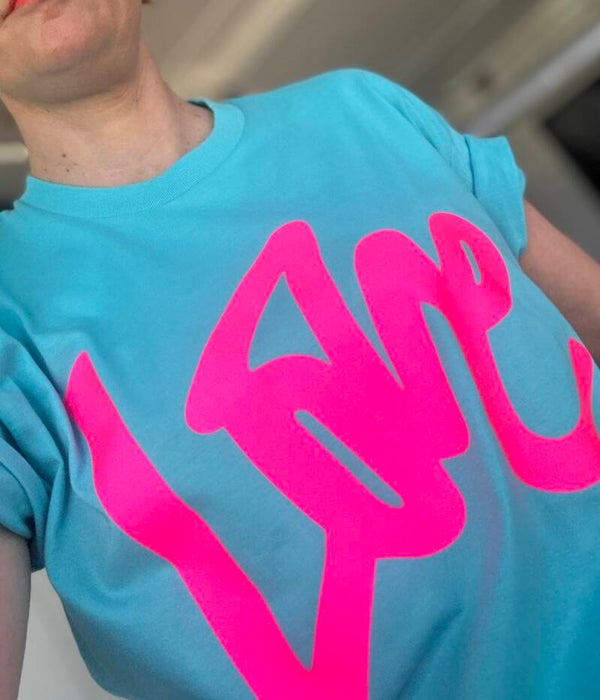 This unisex longline blue t-shirt is brought to life with vibrant neon pink “Love” lettering. Perfect for layering or wearing solo.