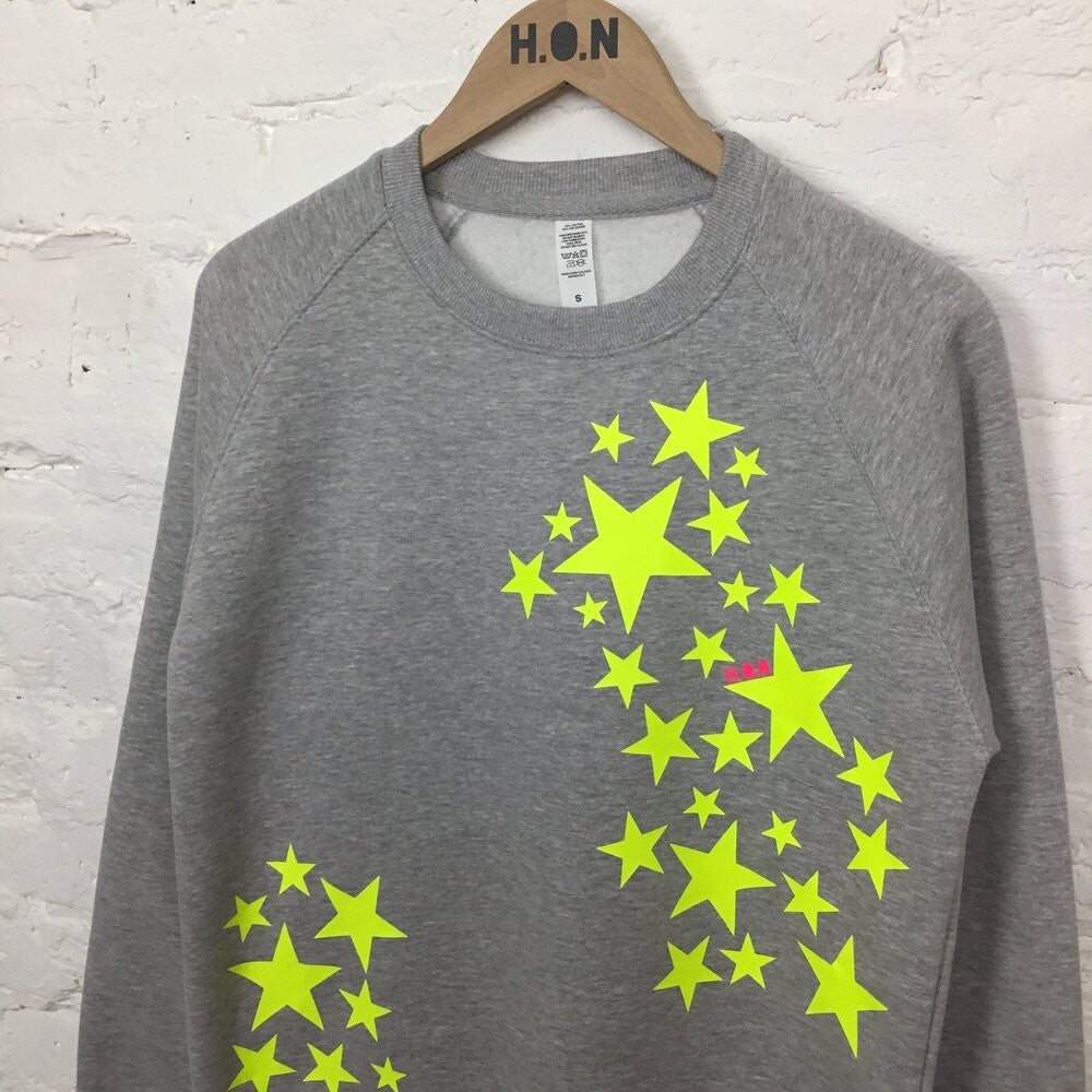This unisex grey sweatshirt features vibrant neon yellow stars, combining comfort with standout style. Easy to layer and effortlessly eye-catching.